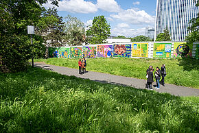 "C'est un nouveau projet que j'ai eu la chance de conduire, grâce aux liens forts établis avec les acteurs de la culture à Nanterre, nous raconte Delso, locataire de la Coop'. Sur la thématique de la nature en ville, deux œuvres distinctes sont installées. La première a été faite en collaboration avec les jeunes du quartier du Parc. J'ai pu recueillir une cinquantaine de dessins réalisés par les jeunes durant des ateliers. Ensuite, j'ai numérisé, mis en forme et colorisé l'ensemble, afin de créer une œuvre originale, tout en restant le plus fidèle aux dessins originaux. Et puis, nous avons créé des pochoirs que nous avons peints sur du contreplaqué en bois fixé sur les panneaux en aluminium. La seconde œuvre est un linéaire de 15 mètres que j'ai réalisé en solo avec mon style, qui mélange le graffiti, le manga et la pop culture plus généralement.